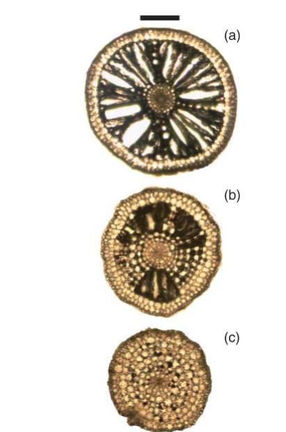 圖1無鐵蝕斑的Lobelia dortmanna根橫截面,位置分別為距根尖(a)30毫米、(b)13毫米和(c)3毫米處。組織孔隙度從根尖附近的約15%向根尖后30毫米處增加至約60%。比例尺:100微米。