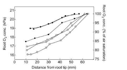 圖4三條有(實心圓)和無(空心圓)鐵蝕斑的Lobelia dortmanna根腔隙中的氧氣濃度隨距根尖距離的變化。氧氣濃度通過微電極內部測量。測量期間,根浸沒在去氧瓊脂中,且根腔隙基部暴露于大氣。