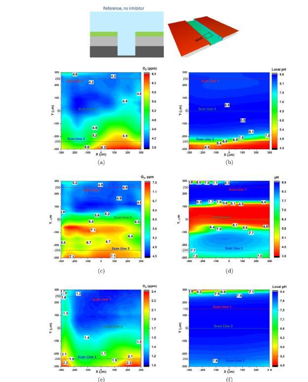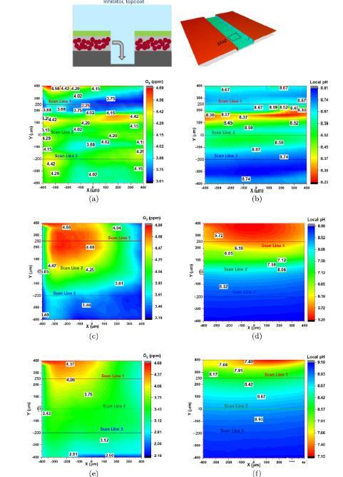 圖4、無(wú)抑制劑參考樣本的SECM:AA2024-T3涂層缺陷中pH和O2濃度表面掃描的頂視圖,時(shí)間點(diǎn)為1小時(shí)、1.5小時(shí)和4小時(shí)。(a)1小時(shí)時(shí)的氧濃度,(b)1小時(shí)時(shí)的pH,(c)1.5小時(shí)時(shí)的氧濃度,(d)1.5小時(shí)時(shí)的pH,(e)4小時(shí)時(shí)的氧濃度,(f)4小時(shí)時(shí)的pH。