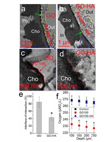 卵膜作為抵御外部風險的第一道屏障,直接接觸納米顆粒。因此,使用TEM和FT-IR檢測了在HA存在和不存在的情況下GO與卵膜的相互作用。在沒有HA的情況下,GO粘附并包裹卵膜,形成厚度約50至600 nm的層;在HA存在下,厚度約800至1200 nm。測量TEM圖像中卵膜與GO之間連接線長度與卵膜總長度的比率,以分析卵膜與納米材料之間的相互作用界面。在沒有HA的情況下,相互作用界面的比率為86.7%,而在HA存在下顯著降至26.4%(p<0.05)。可以看出,卵膜與GO之間的電子致密結構寬度約為20 nm。然而,卵膜與GO-HA之間的電子致密結構不明顯。此外,使用微傳感器分析了卵膜間隙內的氧濃度。在對照樣品中,卵膜附近的氧濃度為269μM,當傳感器插入深度250μm接近胚胎時,卵膜間隙內的氧濃度逐漸降至266μM。與對照結果相似,GO-HA組的氧濃度隨深度增加略有下降,從270μM降至264μM。在暴露于100 mg/L GO的胚胎中,氧濃度顯著下降,在100和250μm深度記錄到的濃度分別為233和227μM。這些數據表明,GO對卵膜的緊密包裹在卵膜內產生了缺氧環境。相反,在HA存在下,卵膜是氧合的,未表現出顯著的缺氧現象。以上結果表明卵膜與GO之間的相互作用比卵膜與GO-HA之間的相互作用更強烈。