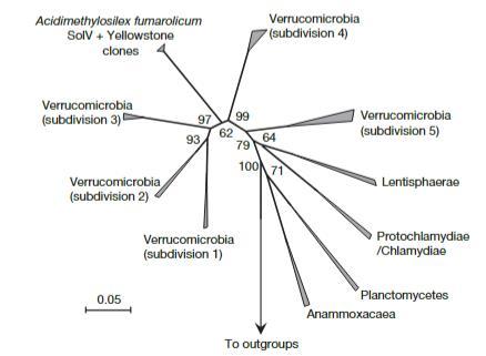 迄今為止,疣微菌門僅包含少數(shù)培養(yǎng)菌株,它們是厭氧或好氧異養(yǎng)菌,在或多或少?gòu)?fù)雜的培養(yǎng)基中生長(zhǎng)于糖類上。然而,環(huán)境克隆文庫(kù)顯示疣微菌門存在巨大的生物多樣性,并且在許多生態(tài)系統(tǒng)(土壤、泥炭沼澤、酸性巖石排水和垃圾滲濾液)中經(jīng)常以相對(duì)較高的數(shù)量出現(xiàn),但生理學(xué)未知。有趣的是,推測(cè)廣泛分布的疣微菌門(其大多數(shù)成員尚未培養(yǎng))可能與地球化學(xué)相關(guān)反應(yīng)有關(guān)。使用菌株SolV 16S rRNA基因序列進(jìn)行BLAST搜索顯示與六個(gè)環(huán)境克隆具有非常高的同一性(98-99%)(圖3),這些克隆是在黃石國(guó)家公園酸性熱泉(Rainbow和Joseph's Coat)微生物群落地球化學(xué)研究期間獲得的(未發(fā)表;NCBI登錄號(hào):AY882698、AY882699、AY882710、AY882819、AY882820和AY882834)。這表明與A.fumarolicum相似的細(xì)菌可能是這些極端環(huán)境的常見(jiàn)居民。新的pmoA和16S rRNA基因序列可能有助于從較少極端的棲息地識(shí)別Planctomycetes/Verrucomicrobia/Chlamydiae超門甲烷氧化菌,并顯示它們的全球分布。