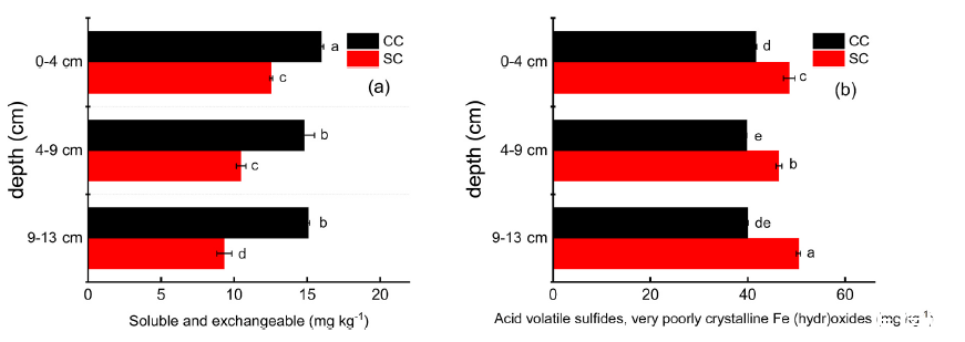 圖4、在持續水淹條件下,0-4厘米、4-9厘米和9-13厘米深度的土壤中,可溶性和可交換部分(a)以及酸性可揮發硫化物和極難結晶的鐵(水合)氧化物部分(b)的含量。