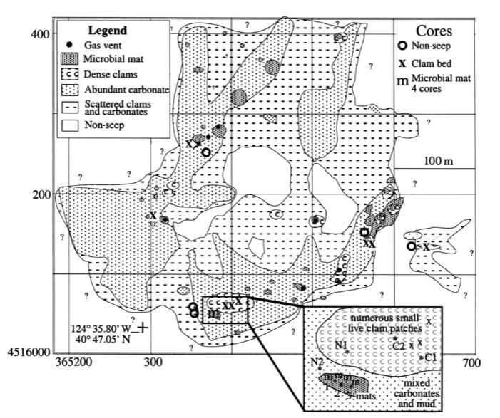 最近,Sahling等人描述了與俄勒岡邊緣水合物脊不同滲漏生境相關的大型動物群落(>500微米)。他們發現,與Acharax、Calyptogena(Vesicomya)和細菌墊為主的沉積物相關的群落密度、組成和多樣性存在差異,這些差異與硫化物通量和濃度的梯度密切相關。在比較北加州陸架(35至55米)的淺水滲漏和非滲漏大型動物群落(>300微米)時,Levin等人僅發現了微小的差異,有幾個物種偏好或避開滲漏區,但沒有發現特化種。對來自520米深處C.(V.)pacifica床的底內動物的初步分析揭示了一個特征性的非滲漏、加州邊緣環境的群落。然而,這項初步研究只關注一種滲漏生境——蛤床。它沒有檢查與附近非滲漏沉積物或細菌墊覆蓋沉積物相關的群落,也沒有收集地球化學數據。