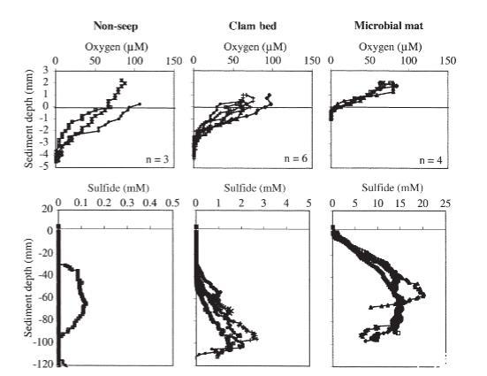 圖4. 微生物墊、蛤床和非滲漏沉積物中氧氣和硫化物的微電極剖面。注意各硫化物圖的不同比例尺。