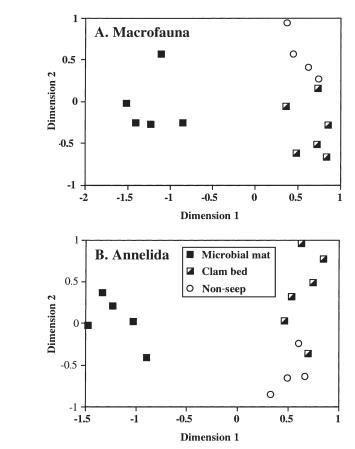 圖6. 微生物墊、蛤床和非滲漏沉積物中大型動物組合的MDS圖。