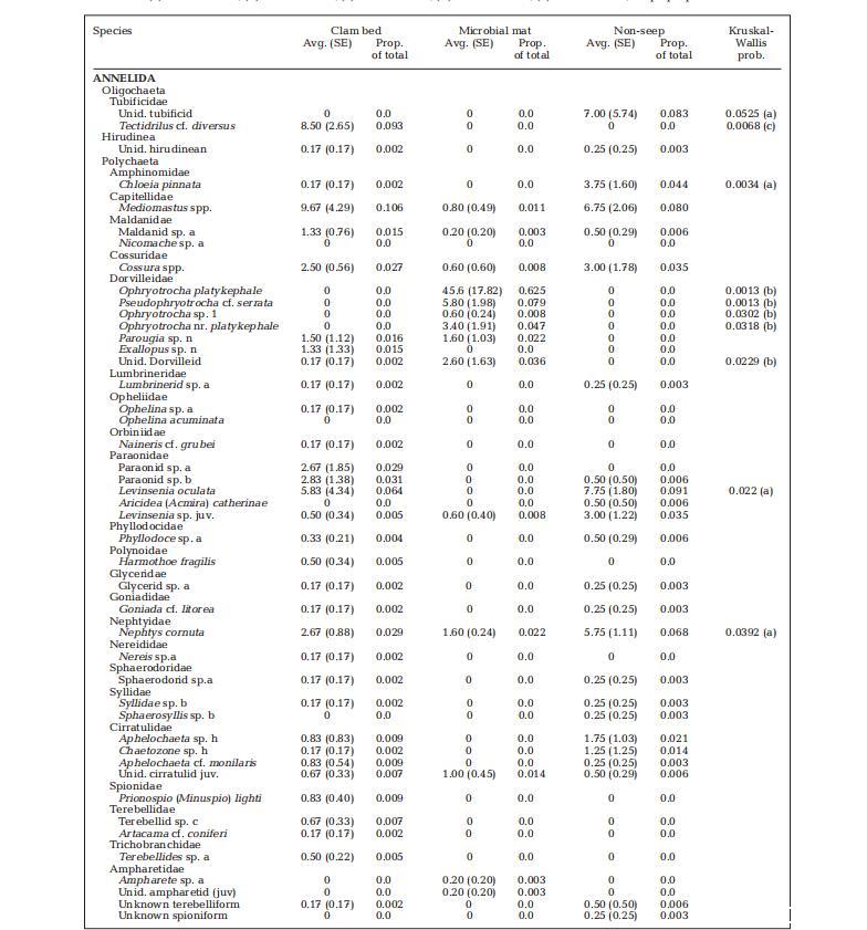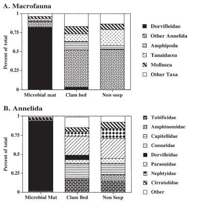 當單獨在科水平上考慮環(huán)節(jié)動物時,微生物墊沉積物似乎與蛤床和非滲漏生境截然不同。墊沉積物中的大多數(shù)環(huán)節(jié)動物是dorvilleid多毛類(92%);已鑒定的dorvilleid中有87%屬于Ophryotrocha屬的3個物種。在微生物墊生境中,環(huán)節(jié)動物中唯一其他占比達到2%的物種是Nephtys cornuta。Tubificid寡毛類、capitellid和paraonid多毛類是蛤床和非滲漏沉積物中最常見的分類群。鰻河地點沒有無腸胃的寡毛類。Tubificid Tectidrilus cf.diversus占蛤床大型動物的9.3%,但在微生物墊和非滲漏沉積物中缺失。其他tubificid寡毛類占非滲漏大型動物的7.8%。