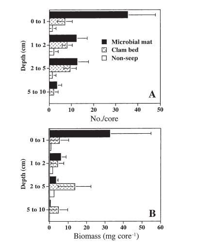 大型動物的垂直分布在生境間有所不同。大型動物(主要是dorvilleids)集中在微生物墊巖心的最上部沉積物中,64%的大型動物分布在0至1厘米層,91%分布在頂部2厘米。在蛤床和非滲漏沉積物中,分別只有48%和40%的大型動物個體存在于頂部1厘米。在非滲漏沉積物中,發現于2厘米以下的大型動物個體比例(38%)顯著高于微生物墊沉積物(9%以下)(反正弦百分比檢驗,p<0.0001),但蛤床的模式(29%在2厘米以下)與其他兩個微生境均無差異(p=0.162)。大型動物生物量在所有微生境中都集中在最上部2厘米。在dorvilleid多毛類中,蛤床沉積物中有46%的個體發現于2至10厘米;微生物墊沉積物中只有不到10%出現在2厘米以下。