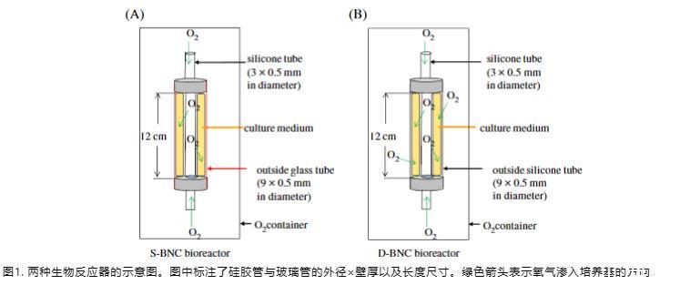 BNC管的生產在Bodin等人13和Hong等人16設計的兩種生物反應器中進行。簡而言之,第一個由Bodin等人描述的(縮寫為S-BNC生物反應器)通過將一根長硅膠管(外徑x壁厚:3x0.5 mm,長度14 cm)固定在玻璃管(直徑9x0.5 mm,長度13 cm)中心來組裝,用于制備S-BNC管,如圖1(A)所示。硅膠管和玻璃管之間長度為12 cm的空腔完全充滿約5 mL預培養物,長硅膠管的內腔連接一個空氣入口。第二個由Hong等人描述的(縮寫為D-BNC生物反應器)用于生產D-BNC管。D-BNC生物反應器由兩根硅膠管(直徑分別為3x0.5 mm和9x0.5 mm)組成,其中較細的管固定在較粗管的中心,如圖1(B)所示。將兩個生物反應器靜態放置在充滿氧氣(10 Pa)的容器中,在30°C下培養14天。