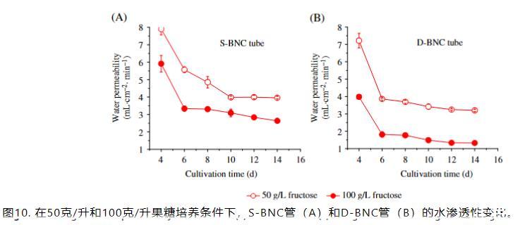 用100 g L-1葡萄糖制備的S-BNC管顯示出比用50 g L-1葡萄糖獲得的管略弱的強度(圖8(A)),盡管最終BNC產量如圖7所示高出4%。用50 g L-1和100 g L-1果糖制備的S-BNC管的最終強度(14天)未顯示顯著差異(P>0.05)。與用葡萄糖獲得的D-BNC管相比,圖8(B)清楚地顯示了用果糖制備的D-BNC管具有更強的拉伸強度,表明較高的果糖濃度由于更高的BNC產量(圖7)導致更高的強度。用不同葡萄糖濃度制備的D-BNC管的強度未顯示顯著差異(P>0.05),這與D-BNC產量相似。目前尚不清楚為什么S-BNC管的強度與產量無關。通常,更大的BNC產量應導致更高的拉伸強度。一個可能的解釋是,除了BNC質量含量和纖維網絡外,BNC纖維的排列、聚合度和結晶度也可能在機械性能中起關鍵作用。這些與纖維相關的因素可能受糖的類型和濃度以及生物反應器類型的影響,應在未來的工作中予以考慮。