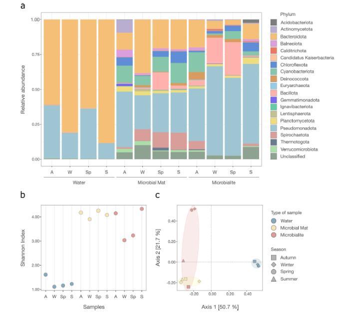 圖5、水體、軟微生物墊和微生物巖中的原核生物多樣性隨季節變化。a顯示不同季節中二十個主要原核生物門的相對豐度(A為秋季,W為冬季,Sp為春季,S為夏季)。b不同季節樣品間alpha多樣性指標(香農指數)的比較。c基于不同季節樣品間Bray-Curtis相異性的主坐標分析(PCoA)。
