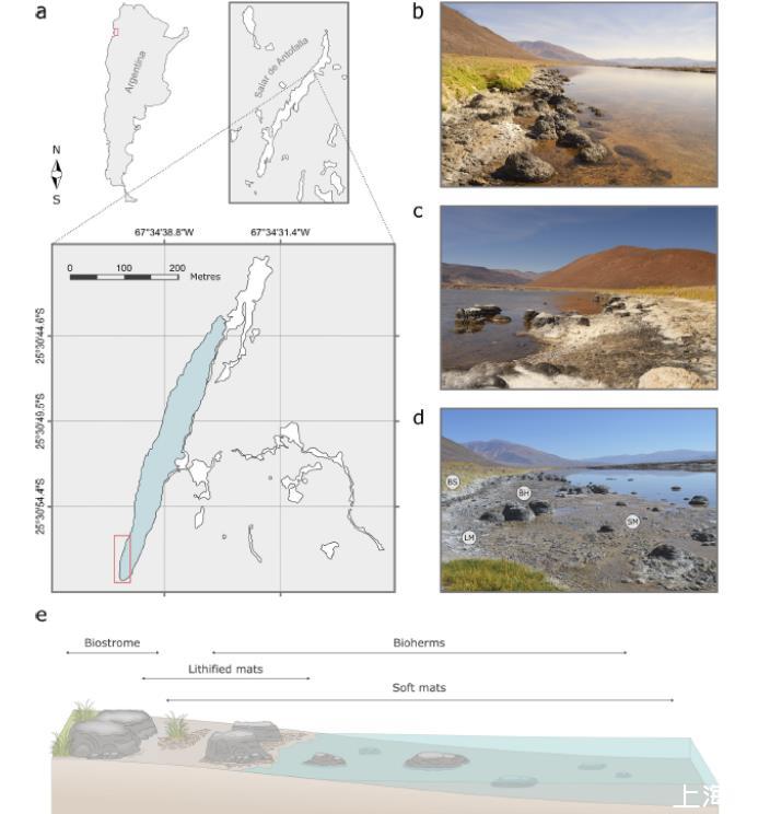 圖1、Laguna Pozo Bravo擁有一個類似古代地球生物結構的現代微生物巖礁。a)Laguna Pozo Bravo在薩爾瓦多·德·安托法利亞(阿根廷卡塔馬卡省)的位置及采樣區域。采樣區域(瀉湖西南邊緣)用紅色框標出。b)從瀉湖中西部邊緣看到的微生物巖礁的北視圖。c)從瀉湖中西部邊緣看到的微生物巖礁的南視圖。d)從采樣區域看到的微生物巖礁的北視圖。e采樣區域潮間帶微生物結構的過渡。BS生物層,LM石化墊(碳酸鹽路面),BH生物丘,SM軟墊。