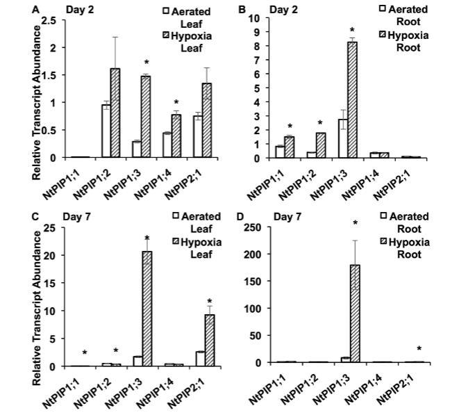 圖6.暴露于通氣良好和低氧條件后,煙草質(zhì)膜內(nèi)在蛋白的轉(zhuǎn)錄豐度。(A)暴露2天后葉片中和(B)根中,以及(C)暴露7天后葉片中和(D)根中所選PIPs的相對轉(zhuǎn)錄豐度。PIPs的轉(zhuǎn)錄豐度通過qRT-PCR分析中的標(biāo)準(zhǔn)曲線法測定,并針對兩個參考基因EF1-α和L25轉(zhuǎn)錄豐度的幾何平均值進(jìn)行標(biāo)準(zhǔn)化。星號表示同一天通氣良好與低氧處理之間基因表達(dá)的顯著差異;下表列出了第2天與第7天之間比較的P值(ANOVA,Tukey檢驗(yàn),P≤0.05,n=6±標(biāo)準(zhǔn)誤)。