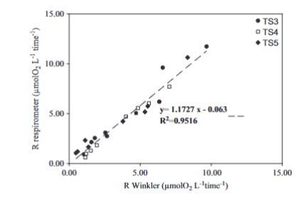 圖6.冬季時間序列實驗(時間序列3,時間序列4,時間序列5)中,使用溫克勒技術在125毫升瓶子和極譜氧電極測得的呼吸速率之間的相關性。數據對應于最小培養時間到培養結束的時段。氧電極的數據計算為相關時段斜率值乘以該時段的培養小時數。