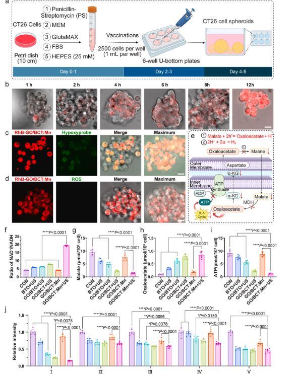 圖5、GO/BCT:Mn MDM與腫瘤球的相互作用。a,腫瘤球體建模示意圖。b,腫瘤球體對(duì)GO/BCT:Mn攝取的時(shí)間依賴分析。圖示腫瘤球體在0、1、2、4、8和12小時(shí)時(shí)對(duì)RhB-GO/BCT:Mn(紅色)的攝取情況。比例尺:20微米。c,使用Hypoxy探針對(duì)腫瘤球組織進(jìn)行缺氧成像。探針的信號(hào)強(qiáng)度(綠色)突出顯示低氧濃度區(qū)域,表明腫瘤組織通常存在缺氧微環(huán)境。刻度條:20微米,RhB-Go/BCT:Mn超聲刺激后腫瘤球體中活性氧(ROS)生成。圖示了在腫瘤球體共培養(yǎng)RhB-GO/BCT:Mn(紅色)12小時(shí)并進(jìn)行超聲刺激(1.5 W/cm2,1 MHz,50%占空比,3分鐘)后,腫瘤球體中活性氧(綠色)的產(chǎn)生情況。比例尺:20μm。e,超聲刺激后壓電納米粒子對(duì)腫瘤能量代謝影響的示意圖。f,腫瘤領(lǐng)域中不同PZNPs(對(duì)照組和實(shí)驗(yàn)組:BTO+US、GO/BTO+US、GO/BCT+US、GO/BCT:Mn、GO/BCT:Mn+US)刺激腫瘤球體中的NAD+/NADH比值。g,不同PZNPs超聲刺激后腫瘤球體中蘋果酸鹽濃度,不同PZNPs超聲刺激后腫瘤球體中草酰乙酸酯濃度。i,不同PZNPs超聲刺激后腫瘤球體ATP濃度。j,不同PZNP超聲刺激后腫瘤球體呼吸鏈復(fù)合物I-V的活性。