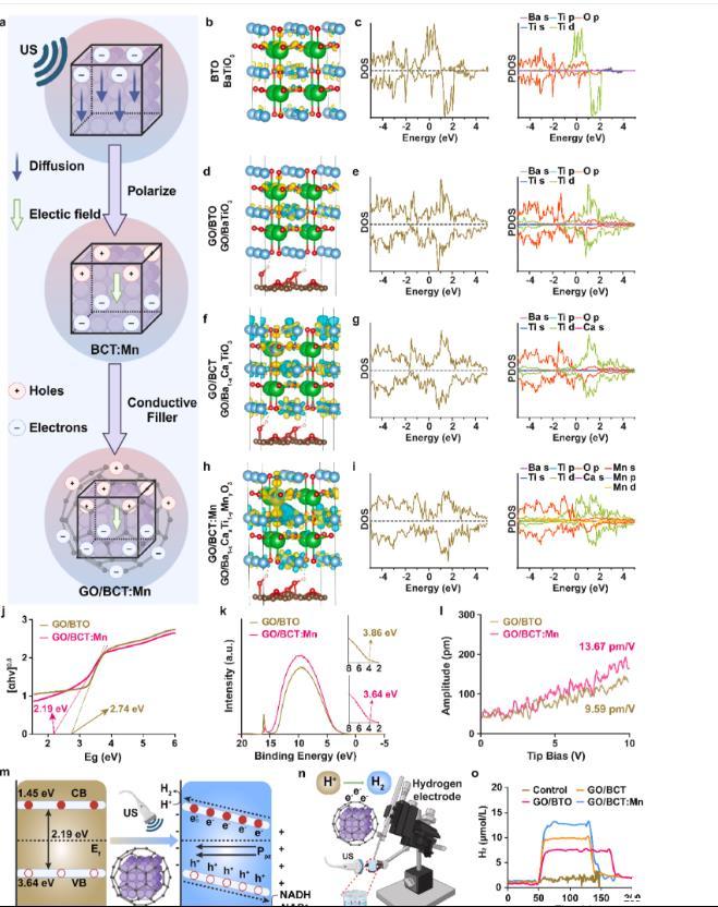 圖3、GO/BCT:Mn.a的第一原理計(jì)算及壓電性質(zhì)分析,超聲刺激下GO/BCT:Mn內(nèi)部偏振的示意圖。b,BTO晶體結(jié)構(gòu)的幾何表示。本圖闡明了BTO的晶體學(xué)排列,突出鋇(Ba)、鈦(Ti)和氧(O)原子的空間定位。c,BTO的態(tài)投射圖(DOS,左)和投射態(tài)密度圖(PDOS,右)。這些圖示展示了電子態(tài)在不同能級(jí)上的分布,特別關(guān)注原子軌道在費(fèi)米能級(jí)附近的貢獻(xiàn)。d,GO/BTO晶體結(jié)構(gòu)的綜合表示。此圖強(qiáng)調(diào)了GO層與晶體結(jié)構(gòu)內(nèi)BTO粒子之間的界面和鍵合特性。E,GO/BTO的DOS(左)和PDOS(右)示意圖。這些圖示突出了GO引入引發(fā)的BTO電子結(jié)構(gòu)變化,特別強(qiáng)調(diào)了費(fèi)米能級(jí)電子態(tài)的變化,表明電子性質(zhì)的變化。f,GO/BCT晶體結(jié)構(gòu)的幾何表示。本圖展示了GO/BCT復(fù)合結(jié)構(gòu)的結(jié)構(gòu),其中GO框架與BCT集成。g,GO/BCT的DOS(左)和PDOS(右)示意圖。這些圖提供了關(guān)于GO與BCT集成如何影響復(fù)合材料電子性質(zhì)的全面比較分析。h,GO/BCT:Mn晶體結(jié)構(gòu)的幾何表示。該圖強(qiáng)調(diào)了Mn在GO/BCT矩陣中的摻入位置,對(duì)于理解Mn摻雜對(duì)復(fù)合材料性質(zhì)的空間分布及潛在影響至關(guān)重要。I)GO/BCT:Mn的DOS(左)和PDOS(右)示意圖。顯示了Μ摻雜導(dǎo)致的電子結(jié)構(gòu)變化,特別是在費(fèi)米能級(jí)附近,顯示導(dǎo)電性和共價(jià)性質(zhì)的變化。j,GO/BTO和GO/BCT:Mn的紫外-可見光(UV–Vis)漫反射光譜(DRS)光譜及其能隙分析。k,GO/BTO和GO/BCT:Mn的紫外光電子光譜(UPS)光譜及其價(jià)帶分析。l,由PFM分析的單個(gè)GO/BTO納米粒子和單個(gè)GO/BCT:Mn納米粒子的d33壓電系數(shù)。m,超聲觸發(fā)下GO/BCT:Mn的能級(jí)變化和電子傳遞示意圖。n,超聲觸發(fā)下GO/BCT:Mn生成氫氣機(jī)制的示意圖及測(cè)試氫電極生成氫的實(shí)驗(yàn)裝置。o,不同組(對(duì)照組和實(shí)驗(yàn)組:GO/BTO、GO/BCT、BCT:和GO/BCT:Mn)在超聲觸發(fā)(1.5 W/cm2,1 MHz,50%占空比)下氫的產(chǎn)生。