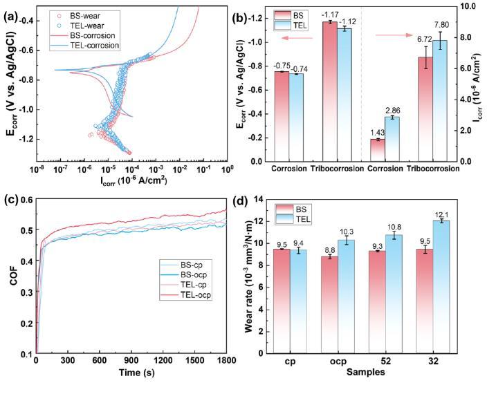 圖3、電化學與摩擦學參數。(a)動電位極化曲線:滑動使腐蝕電位(Ecorr)負移,TEL中腐蝕電流密度(Icorr)更高。(b)Ecorr與Icorr數值:TEL中腐蝕速率顯著提升。(c)摩擦系數(COF):TEL-ocp的COF更高,歸因于硬質Al?O?磨粒的形成。(d)磨損率:TEL環境使磨損率增加超17%,凸顯腐蝕-磨損協同效應。
