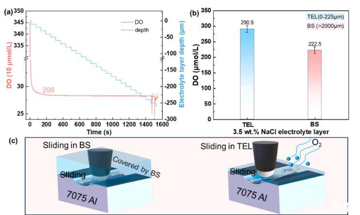 圖4、在BS和TEL環境中溶解氧的分布情況:(a)在3.5%重量百分比的NaCl溶液中,溶解氧隨深度增加而變化;(b)平均溶解氧濃度;(c)三相腐蝕過程的示意圖。