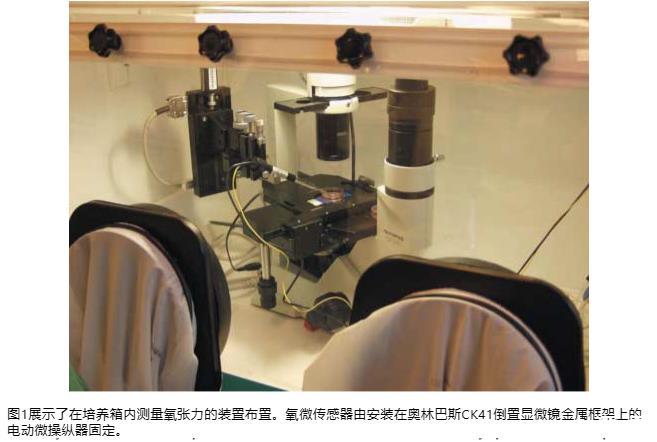 氧微傳感器通過安裝在倒置Olympus CK41顯微鏡金屬框架上的電機驅動微操縱器定位(圖1)。電機驅動微操縱器通過連接筆記本電腦的電機控制器(MC-232)進行控制,筆記本電腦運行Unisense Profix 3.05數據采集軟件。待研究的培養物放置在培養箱內倒置顯微鏡的手動操作XY顯微鏡載物臺上。培養瓶永久放置在電極下方,無攪拌,所有測量均在培養箱內進行。讀數在培養箱外的屏幕上監測,顯微鏡配備有數碼攝像機。圖片通過Olympus DP-Software程序直接獲取和存儲。由于測量時瓶蓋已移除,傳感器可以30度傾角插入而不干擾培養基。