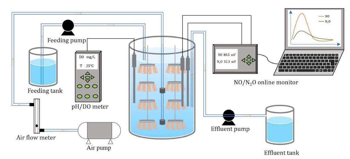 研究簡介:傳統(tǒng)生物脫氮工藝存在曝氣能耗高、碳源需求大等問題。短程硝化反硝化通過將硝化過程控制在亞硝酸鹽階段,可節(jié)省25%的曝氣量和40%的碳源消耗,尤其適用于高氨氮廢水處理。NO作為氮循環(huán)中的關鍵中間體,既有毒性作用,又可能通過選擇性抑制亞硝酸鹽氧化菌(NOB)促進PND的穩(wěn)定運行。然而其在高氨氮廢水處理中的具體角色尚不明確。本研究聚焦于高氨氮廢水的生物處理,重點探討了在序批式生物膜反應器(SBBR)中實現(xiàn)短程硝化反硝化(PND)的可行性,并深入分析了一氧化氮(NO)在該過程中的產(chǎn)生機制及其功能作用。研究旨在為高氨氮廢水的高效低碳處理提供理論依據(jù)和技術支持。研究采用SBBR處理氨氮濃度為1000 mg-N/L的合成廢水,碳氮比(C/N)為5。反應器運行142天,每個運行周期包括缺氧、好氧曝氣、沉淀等階段,通過在線監(jiān)測氨氮、亞硝酸鹽、硝酸鹽、溶解氧、NO和N?O濃度,分析污染物轉化規(guī)律。同時,通過16S rRNA高通量測序技術解析微生物群落結構演變。本研究首次系統(tǒng)揭示了NO在高氨氮廢水短程脫氮中的“雙刃劍”作用:適量NO可促進PND穩(wěn)定,而過量則導致脫氮效率下降。生物膜結構形成的氧梯度為同步硝化反硝化提供了理想微環(huán)境,顯著提升了脫氮效率。研究成果為高氨氮廢水處理的低碳化優(yōu)化提供了新思路,對實際工程中工藝調控與溫室氣體減排具有重要指導意義。