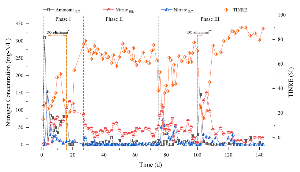 圖2、實驗期間氨氮、亞硝酸鹽、硝酸鹽濃度和TINRE的變化曲線,圖中線條標示了SBBR的不同階段。