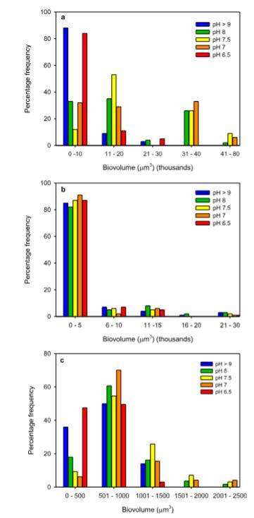 隨著DIC供應(yīng)量的增加和pH值從pH>9降至pH 7,M. bornhemisense單個菌落的生物體積顯著增加,而pH 6.5處理組的生物體積與對照組無顯著差異(圖4a)。對照組中72%的單個菌落生物體積介于2500至5000μm3之間,而pH 8條件下67%的菌落、pH 7.5條件下87%的菌落以及pH 7條件下80%的菌落,其生物體積顯著大于2500-5000μm3的尺寸等級(p<0.05)(圖4a)。pH 6.5條件下菌落的生物體積尺寸等級與對照組無顯著差異(圖4a)。第二次實驗中的M. pusillum菌落也顯示出類似的趨勢,即隨著CO2的添加,生物體積增加,但pH 6.5 HRAMs除外。對于P. boryanum,對照組與各處理組之間單個菌落的生物體積無顯著差異(圖4b)。第一次實驗中的P. duplex菌落也無顯著差異。D. opoliensis單個菌落的生物體積隨著CO2的添加而增加。對照組中84%的單個菌落生物體積介于250至750μm3之間,而pH 8條件下50%的菌落、pH 7.5條件下59%的菌落以及pH 7條件下49%的菌落,其生物體積顯著更大(p<0.05)(圖4c)。pH 6.5條件下菌落的生物體積與對照組無顯著差異(圖4c)。D. abundans也顯示出類似的趨勢,即隨著CO2添加量的增加(直至pH 7),生物體積增加。這主要是由于與對照組和pH 6.5相比,8細胞菌落的頻率增加,而4細胞菌落減少。Ankistrodesmus falcatus則表現(xiàn)出相反的趨勢,對照組和pH 6.5條件下的菌落生物體積顯著大于pH 8、pH 7.5和pH 7條件下的菌落。