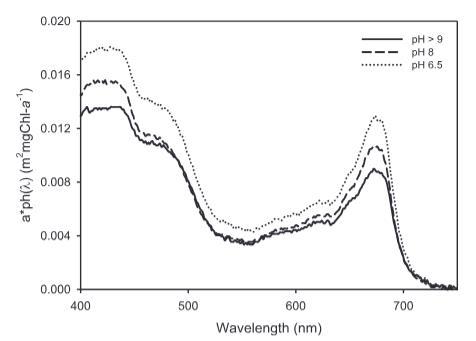 葉綠素a比吸收系數(shù)(a_ph(λ))隨著pH的降低而增加(圖6)。對照組的a_ph(675)和a_ph(440)均顯著低于(p < 0.01)CO?添加處理組(表4)。pH 6.5處理組的a_ph(675)和a_ph(440)顯著高于(p < 0.01)所有其他處理組,而這兩個參數(shù)在pH 7時顯著高于pH 7.5(p < 0.05)和pH 8(p < 0.01),后兩者之間沒有顯著差異(表4)。450-650 nm范圍內(nèi)的總吸收(a_ph∑??????)隨著pH的降低而顯著增加(表4)。pH 6.5處理組的包裝效應(yīng)系數(shù)(Qa)顯著高于(p < 0.01)所有其他處理組,而對照組顯著低于(p < 0.01)所有處理組(表4)。pH 7處理組的Qa顯著高于pH 7.5(p < 0.05)和pH 8(p < 0.01)處理組,后兩者之間沒有差異。這些結(jié)果表明包裝效應(yīng)隨著pH的降低而減小。包裝效應(yīng)約占對照中微藻光吸收的56%,而在pH 6.5時僅占41%。