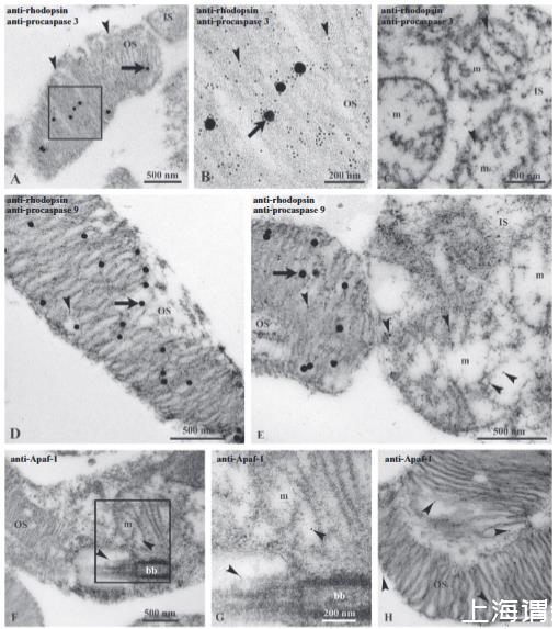 圖9、牛視網(wǎng)膜透射電鏡圖。Procaspase 3 (A-C)、procaspase 9 (D-E) 和 Apaf-1 (F-H) 的表達(dá)。(A-E) 視網(wǎng)膜用抗視紫紅質(zhì)(Rh;大,40納米直徑金顆粒;箭頭)和抗procaspase 3或抗procaspase 9(小,10納米直徑金顆粒;箭頭)抗體雙標(biāo)記。(A-B) 視桿細(xì)胞外段制備物。(A)中的方框區(qū)域在(B)中放大,顯示同時(shí)表達(dá)視紫紅質(zhì)和procaspase 3的視桿細(xì)胞外段盤膜。(C) 內(nèi)段(IS)中三個(gè)表達(dá)procaspase 3的線粒體(m)。(D) 一個(gè)同時(shí)表達(dá)Rh和procapsase 9的視桿細(xì)胞外段。(E) 視桿細(xì)胞外段(左)和內(nèi)段(右)之間的連接區(qū)域。在視桿細(xì)胞外段盤膜中,抗Rh和抗procaspase 9共定位;在線粒體(m)中,僅可見(jiàn)procaspase 9。(F-G) 顯示Apaf-1表達(dá)(箭頭)的視桿細(xì)胞外段(左)和內(nèi)段(右)之間的連接區(qū)域,Apaf-1在視桿細(xì)胞外段和內(nèi)段中均有表達(dá)。(F)中的方框區(qū)域在(G)中放大,顯示一個(gè)標(biāo)記的線粒體以及靠近纖毛基體(bb)的胞質(zhì)溶膠。(H) 一個(gè)表達(dá)Apaf-1(箭頭)的視桿細(xì)胞外段。