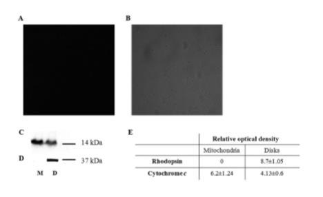 我們?cè)缙谟械鞍踪|(zhì)組學(xué)數(shù)據(jù)表明細(xì)胞色素c在分離純化的盤膜中表達(dá),這里我們證實(shí)了它在分離的視桿細(xì)胞外段盤膜內(nèi)部的存在。根據(jù)我們的標(biāo)記技術(shù)對(duì)用抗細(xì)胞色素c抗體標(biāo)記的盤膜進(jìn)行的CLSM成像顯示盤膜未被標(biāo)記。實(shí)際上檢測(cè)不到熒光信號(hào)(圖7A),盡管盤膜在透射圖像中可見(jiàn)(圖7B)。相比之下,Western印跡顯示細(xì)胞色素c在盤膜以及用作陽(yáng)性對(duì)照的線粒體中表達(dá)(圖7D),并且細(xì)胞色素c的朝向通常與ATP合酶F1部分的朝向相反。盤膜對(duì)視紫紅質(zhì)的存在呈陽(yáng)性染色(圖7C)。結(jié)果通過(guò)光密度分析總結(jié)(圖7E)。