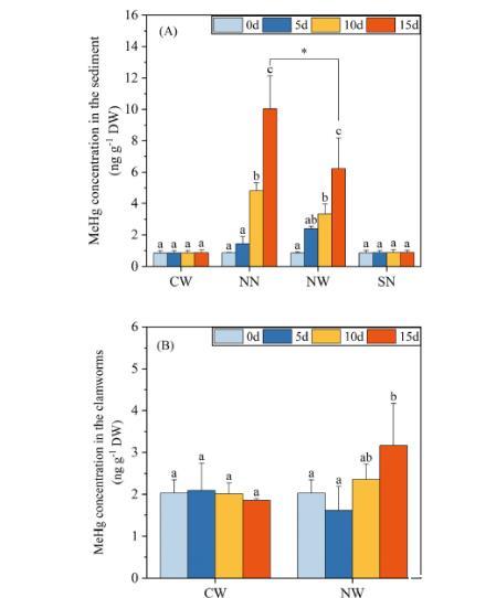 圖2、不同采樣點沉積物(A)和沙蠶(B)中甲基汞濃度(平均值±標準差,n=4)。CW:清潔沉積物+沙蠶;NN:加汞非滅菌沉積物無沙蠶;NW:加汞非滅菌沉積物+沙蠶;SN:加汞滅菌沉積物無沙蠶。字母和星號表示采樣點與處理間在p<0.05水平的顯著差異。從圖中可以看出加汞沉積物中甲基汞濃度急劇上升(NN組:0.87±0.017至10.0±2.1 ng·g?1·dw;NW組:0.86±0.052至6.2±2.0 ng·g?1·dw),而滅菌處理組無顯著變化。沙蠶中甲基汞濃度的增加表明其積累了新生成的甲基汞。