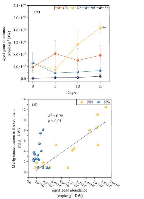 圖3、(A)實驗期間沉積物中 hgcA 的豐度(每克溶解物中的拷貝數,均值±標準差,n = 4)。CW:有沙蠶的清潔沉積物;NN:未添加汞的含汞沉積物(無蠕蟲);NW:添加汞的含沙蠶沉積物;SN:經過滅菌處理的不含蠕蟲的含汞沉積物。星號表示不同處理之間在 p < 0.01 的水平上存在顯著差異。(B)沉積物中 hgcA 基因豐度與甲基汞濃度之間的關系。hgcA基因豐度與甲基汞濃度的顯著正相關關系,證實了汞甲基化微生物是沉積物中甲基汞生產的主要貢獻者。