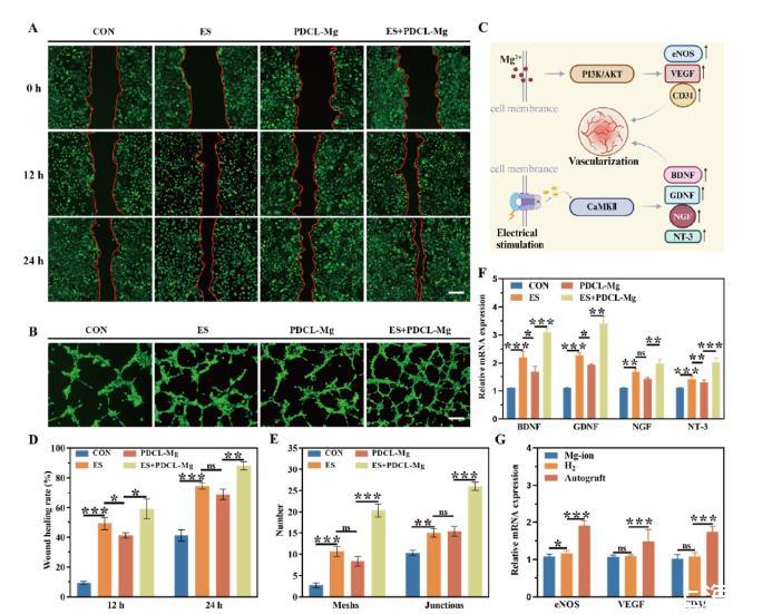 圖1、構建一種能釋放氫氣以改善周圍神經再生微環境的電活性神經導管的示意圖。在周圍神經損傷后,炎癥反應和氧化應激會抑制周圍神經的再生。PDCL-Mg 降低了活性氧水平,促進了巨噬細胞極化,加速了血管生成,加速了生長因子的釋放,并促進了大鼠的再生微環境、神經再生和運動功能的恢復。