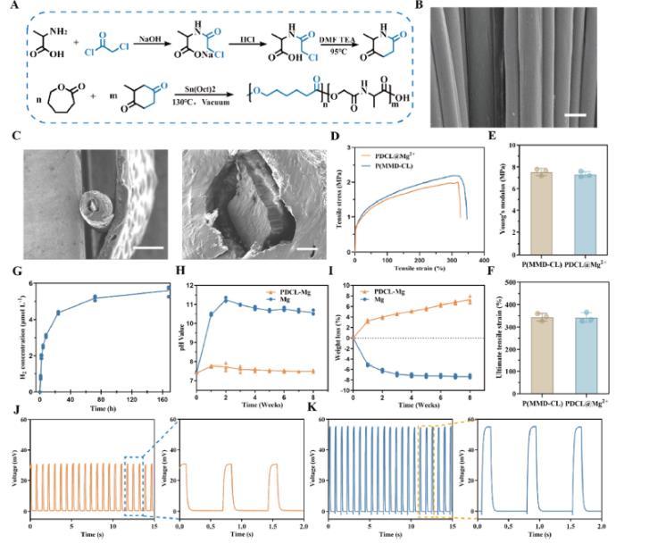 圖4、聚(MMD-CL)靜電紡絲膜的合成及物理化學特性研究。(A)聚(MMD-CL)聚合物的制備。(B)靜電紡絲纖維膜的掃描電子顯微鏡圖像。比例尺為 2 微米。(C)用聚(MMD-CL)包裹的鎂絲的掃描電子顯微鏡圖像。比例尺為 200 微米和 20 微米。(D)膜的應力-應變曲線。(E)膜的楊氏模量(n = 3)。(F)膜的極限拉伸應變(n = 3)。在導管降解過程中(G)使用氫氣微電極檢測在體外實時測量氫氣釋放濃度。(H)pH 值變化;(I)導管的失重率。在(J)PBS 溶液和(K)空氣中的 PDCL-Mg 線圈內部在交變磁場下的電壓變化。