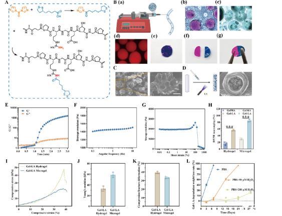 圖2、填充型 Gel-LA 微凝膠的合成及物理化學特性研究。(A)Gel-LA 的合成機制。(B)(a)Gel-LA 微凝膠的制備。(b)用羅丹明 B 染色的微凝膠照片。(c)用亞甲基藍染色的微凝膠照片。(d)用羅丹明 B 染色的微凝膠的熒光圖像。(e)將微凝膠混入用羅丹明 B 和亞甲基藍染色的凝膠中所得的照片。(f)用亞甲基藍和羅丹明 B 染色的半圓形水凝膠的照片。(g)在光照后形成完整水凝膠的半圓形水凝膠的照片。比例尺為 200 微米。(C)Gel-LA 微凝膠的掃描電子顯微鏡圖像。規模條帶尺寸分別為 200 微米和 50 微米。(D)填充有微凝膠的神經導管的掃描電子顯微鏡圖像。比例尺為 500 微米。(E)溶膠 - 凝膠轉變與光交聯時間的關系。(F)水凝膠的頻率掃描測量(0.1 - 10 赫茲;1% 應變)。(G)水凝膠旋轉應變掃描曲線(0.01 - 10,000% 應變;1 赫茲)。(H)水凝膠和微凝膠(Gel-LA 和 GelMA)的 DPPH 清除情況。 (I)水凝膠和微凝膠的應力 - 應變曲線(n = 3)。(J)水凝膠和微凝膠的楊氏模量(n = 3)。(K)水凝膠和微凝膠的極限壓縮應變(n = 3)。(L)Gel-LA 水凝膠在含有不同濃度的過氧化氫 PBS 溶液中的降解情況。
