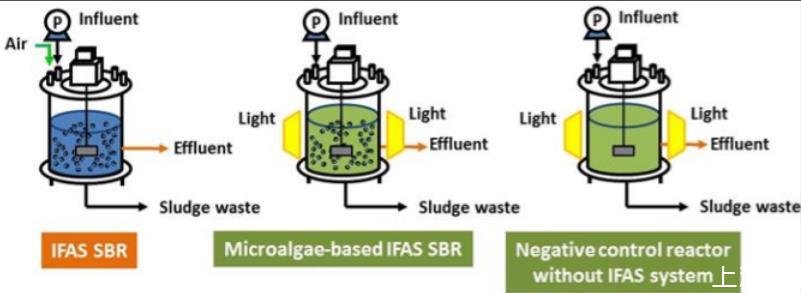 圖3-1. 基于微藻的IFAS(MAIFAS)SBR及兩個對照(IFAS SBR和無IFAS介質的藻類SBR)示意圖