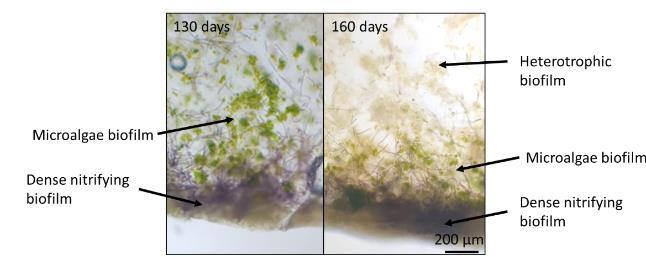 圖3-6. 130天和160天時MAIFAS生物膜的橫截面圖像(放大倍數x40,厚度50μm)。生物膜包埋在組織冷凍介質中。