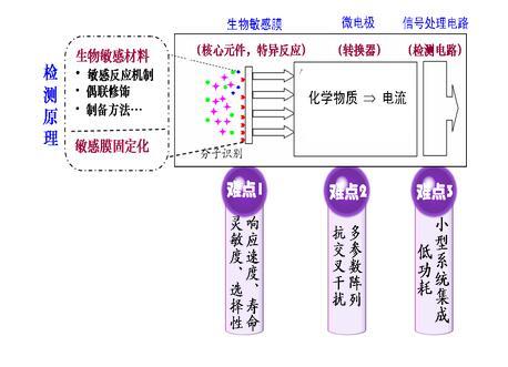 針對(duì)不同需求,確定探測(cè)分析物,基于生物活性分子和納米功能材料技術(shù),對(duì)之進(jìn)行敏感反應(yīng)機(jī)制研究,并進(jìn)一步形成敏感材料試劑配方和膜固定化方法,形成核心技術(shù),再基于微機(jī)電系統(tǒng)技術(shù)和信號(hào)處理技術(shù),突破微電極傳感器制備工藝和便攜式儀器關(guān)鍵技術(shù)難題,形成系統(tǒng)的關(guān)鍵技術(shù)。