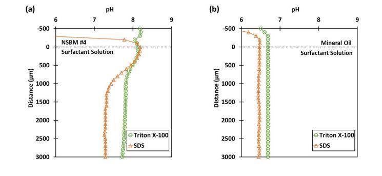 在微電極剖面測量期間,觀察到油和水界面之間的意外pH變化。圖4-4顯示分離分散相和連續相的界面上的pH梯度。在添加NSBM#4或礦物油后1分鐘測量pH。當100 ppm SDS溶液作為連續相時,pH從7.3(體相)清晰增加至8.3(界面)(圖4-4(a))。對于Triton X-100作為連續相,觀察到pH從7.3(體相)增加至8.3(界面)(圖4-4(a))。