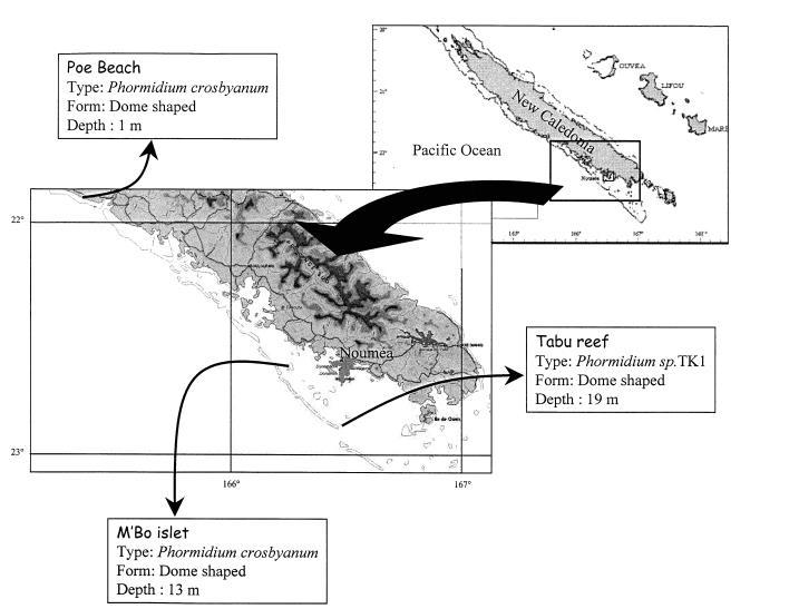 微生物巖樣品是在現(xiàn)場根據(jù)對圓頂狀色素沉著菌落(在藻類文獻(xiàn)中稱為“葉狀體”)的宏觀識別采集的,基于S. Golubic的描述。研究的微生物巖是由屬于席藻屬的單一種群絲狀藍(lán)藻產(chǎn)生的,即Phormidium crosbyanum Tilden和Phormidium sp.TK1。Phormidium sp.TK1和P. crosbyanum的微生物巖穹窿分別采集于新喀里多尼亞西南瀉湖的13米水深(Tabu Reef)和19米水深(M'Bo islet)。另一個P. crosbyanum分離株采集于努美阿以北約200公里的布賴爾附近一個非常淺的后礁環(huán)境(Poe beach)。在這些瀉湖和后礁環(huán)境中,微生物穹窿在沙質(zhì)沉積物上發(fā)育,并與綠藻(仙掌藻)、絮狀藍(lán)藻席和海草(Halophilda)相關(guān),較少在珊瑚碎片和活的塊狀珊瑚群體上;它們通常覆蓋在Opuntia仙掌藻的葉狀體上。