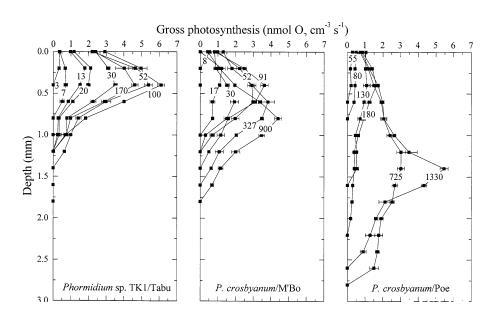 在飽和光照條件下,總光合作用最大值與最大氧氣濃度處于相同的深度層位。Phormidium sp. TK1/ Tabu和P. crosbyanum / M'Bo的光區(qū)分別為1毫米和1.4毫米。在P. crosbyanum / Poe中,可測量的總光合作用深度達2.2毫米。在Phormidium. sp. TK1/ Tabu觀察到最高的最大總光合作用速率,在表面以下0.4毫米處值為5.5 nmol O2 cm-3 s-1。在P. crosbyanum / Poe觀察到最低的最大速率,即在微生物巖表面以下1.2毫米處為3.01 nmol O2 cm-3 s-1。