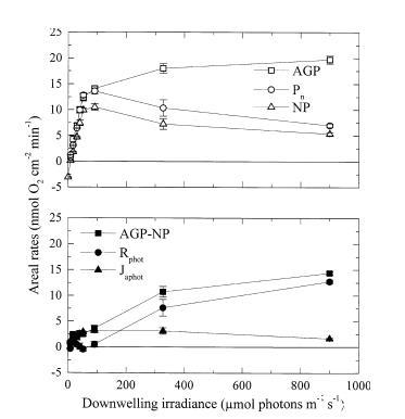 | AGP對E曲線的初始斜率 \( \alpha \) (mol O? mol photons?1) | 0.106 (±0.002) | 0.042 (±0.002) | 0.009 (±0.001) |