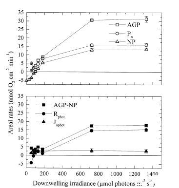 對于在后礁環(huán)境采集的“表層”型P. crosbyanum(Poe站點),在低于200 μmol photons m-2 s-1時,總光合作用和凈生產隨著光照同時增加。與深水型類似,凈生產力、光區(qū)生產力和總生產力面積速率非常相似,因此光區(qū)內沒有可測量的顯著呼吸作用。補償點輻照度比瀉湖樣本測得的高得多;102 μmol photons m-2 s-1 對比 14 μmol photons m-2 s-1。暴露于200 μmol photons m-2 s-1以上的光照導致總生產力面積速率和光區(qū)呼吸的強烈刺激。對于總生產和凈生產力,沒有觀察到光抑制。然而,我們受到人工光源供應的限制,因此無法將微生物巖暴露于大于1400 μmol photons m-2 s-1的光強下。因此,我們不能排除在此光強以上可能發(fā)生光抑制。