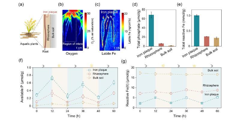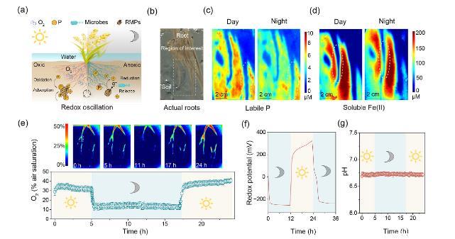 圖1、根區中磷和鐵的日變化。a )通過活性礦物相(RMPs)驅動的根區日循環對磷生物可用性的增強的示意圖。b )實驗裝置中根部的照片圖像。c、d )使用擴散凝膠薄膜成像系統對根區不穩定磷和可溶性 Fe(II) 濃度的日變化進行可視化。e、f )根區氧氣含量和氧化還原電位的日變化。g )根際區 pH 的時間動態變化。誤差條表示三個重復樣本的標準偏差。
