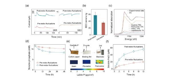 圖4、徑向氧流失(ROL)引起的氧化還原變化促進了活性礦物相(RMPs)的生成。 a、b) 在氧化還原波動前后對綠泥石進行的電化學還原(MER)、電化學氧化(MEO)和電子交換能力(EEC)分析。c )紅色氧化還原波動后綠泥石的鐵物種分析,使用 X 射線吸收光譜進行。d) 紅色氧化還原波動前后綠泥石上的磷酸鹽吸附動力學比較。e )用吸附磷酸鹽的氧化還原激活和未經處理的綠泥石(綠泥石-P)進行電化學還原。f) 在使用綠泥石-P 對綠泥石進行電化學還原過程中電解液中檢測到的溶解 Fe(II)。