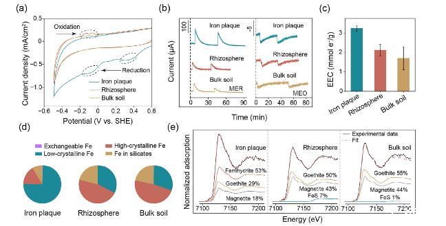 圖2、根部附近形成反應性礦物相(RMPs)。a )電流-電位曲線(以標準氫電極為參照,已報告數據)顯示了氧化還原活性。b )介導電化學還原(MER)和氧化(MEO)曲線,以及 c )鐵斑、根際土壤和整塊土壤的電子交換容量(EEC)測量值。d )通過順序化學萃取表征的鐵組分。e )通過 X 射線吸收光譜鑒定的鐵物種。誤差條表示三個重復樣本的標準偏差。當誤差條不可見時,它們包含在標記符號內。