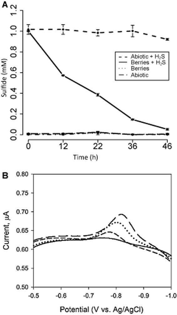 A.在50毫升過濾消毒的沼澤水中用50個小漿果進行微觀孵化時,通過Cline測定法測量硫化物濃度。孵育保持在14小時光照、10小時黑暗循環中。在漿果存在下的孵育過程中消耗了添加至1 mM濃度的硫化物(實線),而非生物對照顯示沒有變化(虛線)。沒有添加硫化物的微觀世界從接近0 mM的初始硫化物濃度沒有可檢測到的變化。誤差棒顯示三個生物重復孵化的標準偏差。
