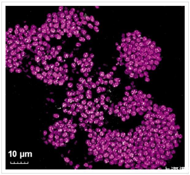 切片粉紅色漿果組織的表面反射共聚焦顯微鏡。紫色硫細菌的自發熒光(激發543 nm,發射550–570 nm)以粉紅色顯示,來自可折射元素硫包裹體的反射信號以白色顯示。