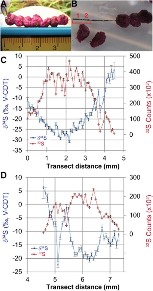 為了研究漿果中硫化物的同位素組成,將大的聚集體(直徑約0.5厘米)穿在24號銀線上并孵育過夜原位(圖7A)。可溶性硫化物以硫化銀的形式沉淀在焊絲上,在每個聚集體下方留下帶有金屬光澤的黑色光澤(圖7 B)。可見的硫化物積累開始于聚集體的表面下方,最暗的硫化物沉積在聚集體的中心,證實了來自微伏安法和硫化物微傳感器的硫化物報告。隨后使用IMS 7f-GEO扇形磁場二次離子質譜儀(SIMS;CAMECA,Gennevilliers,France)按照Fike及其同事(描述的方法分析了這種沉淀的硫化銀的豐度和同位素組成2009年)。沿著穿過兩個漿果的線的橫斷面顯示32 S計數(硫化物豐度)增加,δ減少34 S朝著聚集體中心(圖7 C)。在未發生可見硫化物沉積的情況下(即在漿果邊緣或漿果之間),32 S計數也非常低(圖7 C)。