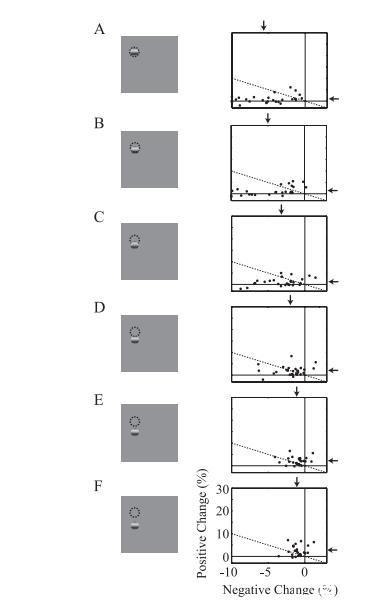 圖5. 第二項LGN實驗的群體數據。A-F部分,刺激圖標(左側)與圖4中的圖標相同。每個散點圖(右側)對應于其左側圖標所描繪的刺激條件,并顯示所有記錄位點觀測到的氧含量變化。每個點代表特定記錄位點平均氧響應的最大負向(橫軸)與正向(縱軸)變化值。最大負向和正向變化分別限定在刺激開始后的前5秒和前10秒內。部分超出圖表顯示范圍(最低達-19%)的數據點已重新縮放至邊界位置以便呈現。各圖中的虛線表示氧含量正負變化相等的分界線。箭頭指示每個分布的平均值。