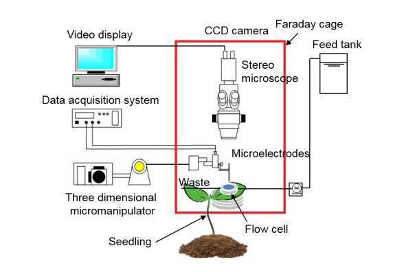 SC-μ-ISE 2的電位使用微電極萬用表(Unisense A/S,丹麥)在室溫下于持續(xù)攪拌狀態(tài)下進行監(jiān)測。所有葉面吸收測量均使用Ag/AgCl參比電極。凈離子通量實驗在葉片/根暴露于Zn2+溶液30分鐘后進行。如圖2所示,將一個定制流動池(5 mL)附著于約100 cm高的酸橙幼苗的葉片上。使用0.5 ml/min的流速通入濃度范圍為0至15.3 mM的Zn2+溶液,以使系統(tǒng)保持平衡。使用三維微操作器(UNISENSE A/S,丹麥)定位所開發(fā)的Zn2+ SC-μ-ISE 2,并利用帶CCD相機的立體顯微鏡(World Precision Instruments, Sarasota, FL)進行觀察。Ag/AgCl參比電極通過一個“助手”夾具固定在流動池中。使用數(shù)據(jù)采集軟件(Sensor Trace Pro, Unisense A/S, Denmark)控制和記錄微剖面。實驗在法拉第籠中進行,以最小化電干擾。將微電極尖端沿垂直于葉片表面的方向移動,并在葉片表面上方的1,000 μm至50 μm范圍內(nèi)(以避免損壞電極尖端),以50 μm為間隔進行微剖面測量。單個剖面在3分鐘內(nèi)完成(響應(yīng)時間<10秒)。