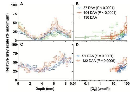 [O2]霞多麗、紅寶石無核和設拉子漿果(A、C、E)在不同成熟階段的[O2]剖面圖以及每個品種(B、D、F)果皮中活組織(LT)的相應示例。(A)霞多麗漿果在2015-2016季節的DAA為87、104和136時采樣。雙向方差分析(重復)顯示,深度占總變異的46.7%(P<0.0001),時間占總變異的29.9%(P<0.0001),交互作用占總變異的8.0%(P=0.058))。水平虛線表示室溫下Millipore水的近似O2飽和值,與測量時的漿果相同。(B)用FDA染色的內側縱向切片(霞多麗),突出了不同成熟階段的LT差異(對應于A)。(C)2016-2017季節在91和132 DAA下采樣的Ruby無核漿果的[O2]配置文件。雙向方差分析(重復)顯示深度占總變異的85.2%(P<0.0001),時間占總變異的1.2%(P=0.0025),交互作用占總變異的3.7%(P=0.048))。(D)Ruby Seedless的LT在兩個相應的采樣日接近100%。(E)2014-2015季節在85和114 DAA上采樣的設拉子漿果的[O2]配置文件。插圖顯示了1.5毫米的輪廓細節。雙向方差分析(重復)顯示,深度占總變異的40.9%(P=0.0005),時間占總變異的19.6%(P<0.0001),交互作用占總變異的6.4%(P=0.43))。(F)設拉子的LT。數據是平均值±SE,對于(A)、(C)和(E),n=3。
